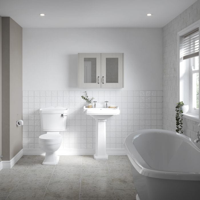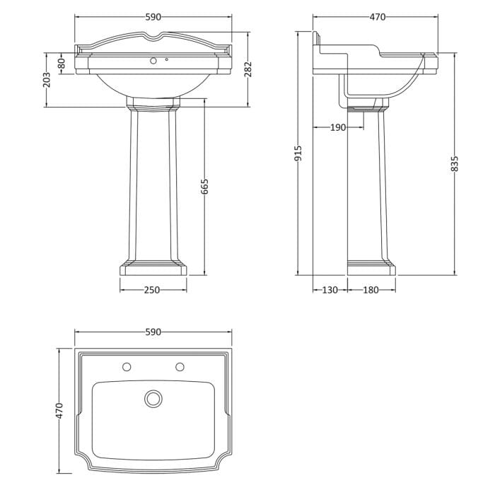 The Cascade Winchester 580mm 2 Tap Hole Basin and Pedestal is a perfect addition to your new washroom, featuring a traditional design, marked by an attractive splashback and intricate contours.